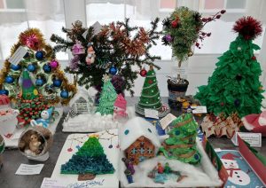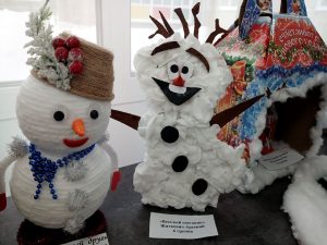 Материалы, из которых изготовлены работы, самые разные: пластиковые крышечки, макаронные изделия, ткань, ватные диски, бумажные втулки, шпагат и многое другое. Выставка включает как коллективные, так и индивидуальные работы. Среди них есть забавные, оригинальные, большие, миниатюрные, яркие и блестящие. Каждая работа заслуживает внимания и похвалы.