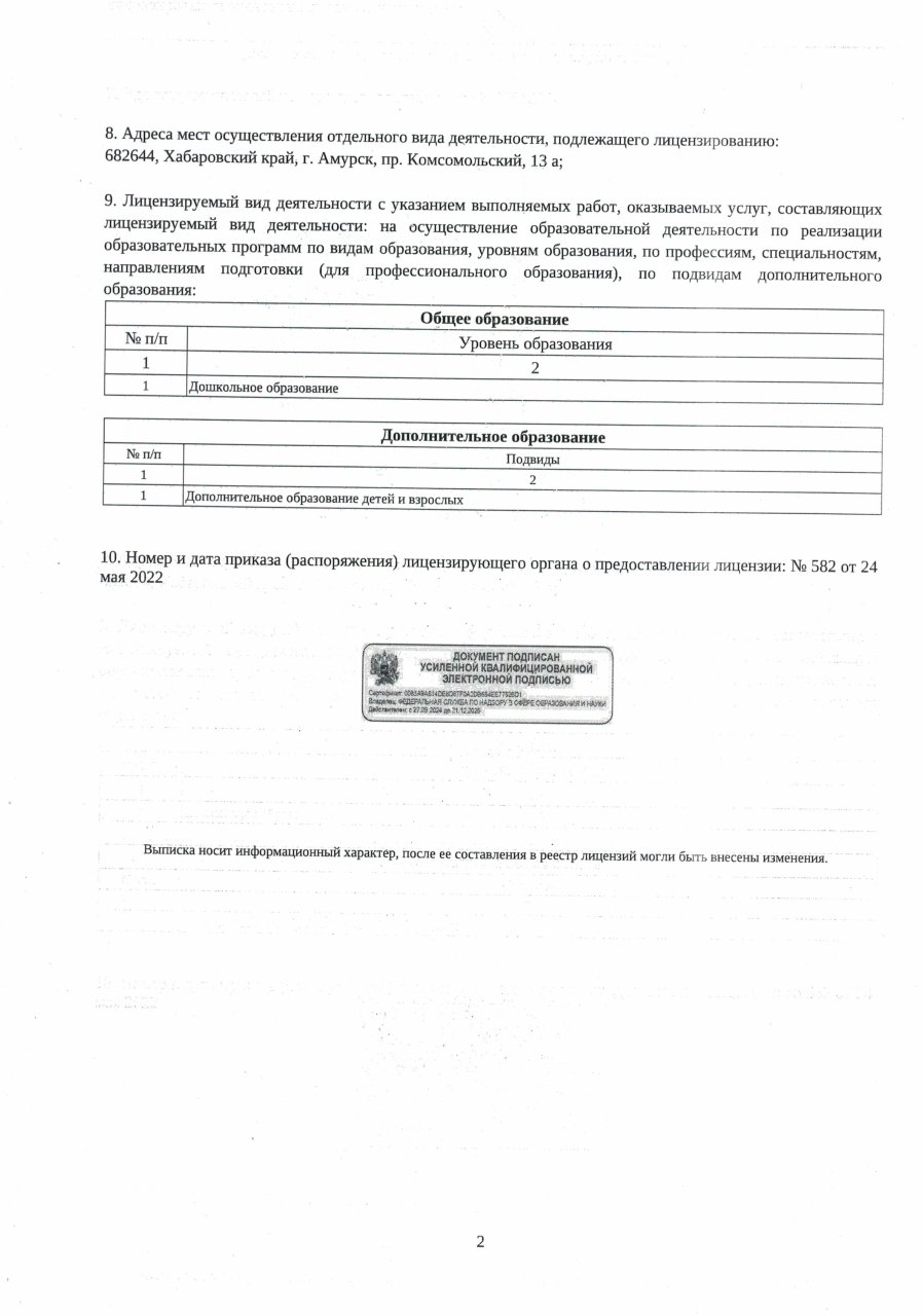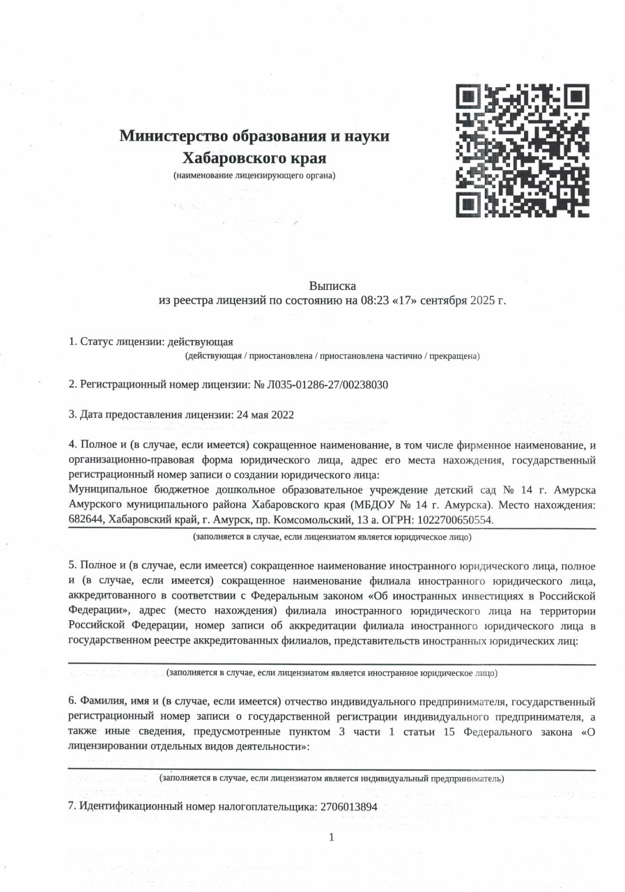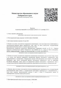 Устав образовательного учреждения зарегистрирован ИФНС по Железнодорожному району г. Хабаровска (свидетельство о внесении записи в Единый государственный реестр юридических лиц от 11.05.2022 г., основной государственный регистрационный номер 1022700650554), утвержден приказом начальника Управления образования, молодежной политики и спорта администрации Амурского муниципального района Хабаровского края от 06.04.2022г. № 206-Д. |